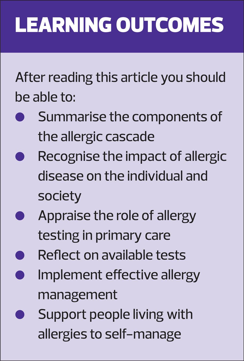 Research continues into the allergic cascade and the atopic march and as a result, a greater range of pharmacological interventions is likely to be made available to people living with allergic disease. This is important because these conditions are common and carry a heavy burden of morbidity, which affects performance at school or work, impairs sleep and negatively impacts on quality of life. The diagnosis of allergic disease is made through careful history taking along with objective testing. The most common test used in primary care is IgE testing, where specific allergens can be identified through a simple blood test. Once the allergen is known, management will be based on avoidance, where possible. Patients can be supported to recognise the value of interventions such as vacuuming, washing, and choosing home furnishings and may also be relieved to know that they do not necessarily need to rehome an allergy-inducing pet. Pharmacological management can include oral, intranasal and inhaled therapies and some patients with allergic asthma will benefit from the use of biologic therapies designed to address specific pathways within the allergic cascade. There is a range of resources available to support people living with allergic disease to ensure that they can self-manage effectively.
