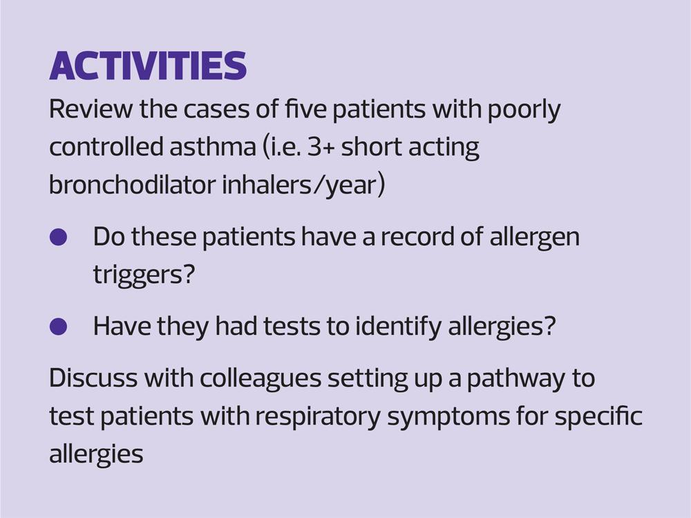Taking a good history is essential when considering allergy-related conditions as a possible diagnosis. Although allergy testing can be useful in helping to define the allergen or allergens responsible for symptoms, the choice of which allergens to test for will depend on the history. Patients should be asked about the possibility of allergic symptoms with a focus on the presence of symptoms, such as rhinitis, sneezing, blocked nose, itchy eyes or itchy nose, or increased asthma symptoms in response to exposure to triggers or changes in the season.13