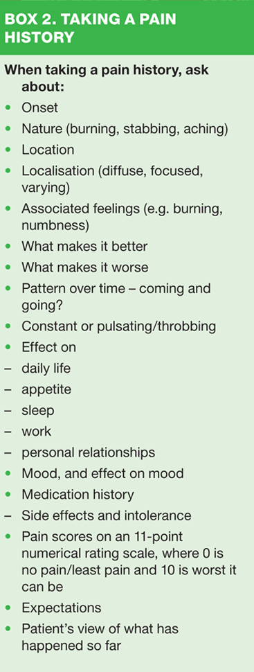 The essential features of a pain history are shown in Box 2, but far more important than knowing what to ask is reminding yourself to ask it in the first place.