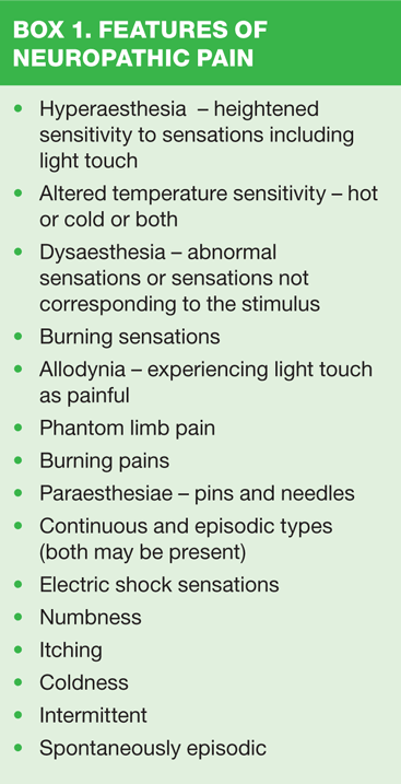 However, neuropathic pain has a number of characteristic features which should alert you to its presence in the patient before you. These include burning or tingling, electric shock-like sensations, hyperaesthesia, dysaesthesia and allodynia.3 These terms are defined in Box 1. Nociceptive pain, on the other hand, is often described as dull and aching, and lacks the unusual qualities of altered sensations, numbness and tingling.