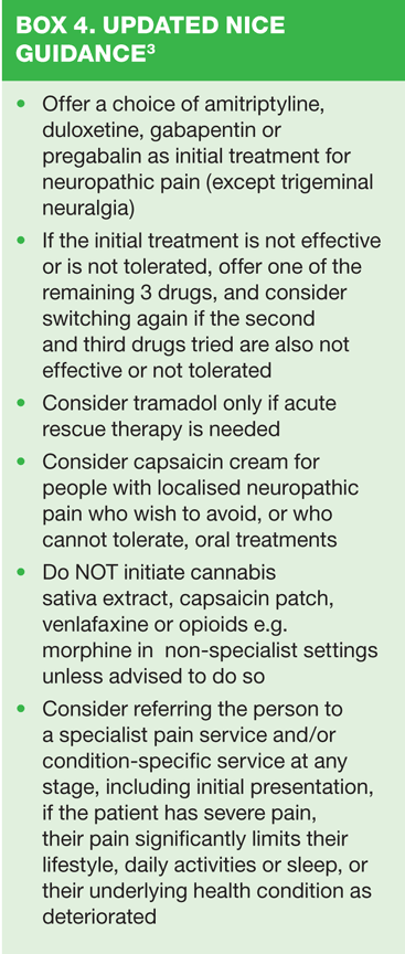 Neuropathic pain can be very difficult to treat and not all patients achieve even partial relief. Working out what's best can be a challenge since all patients are different — and there is unlikely to be a single best answer for any one patient. But there are a number of guidelines available, including the recently updated clinical guidance from NICE.3 (Box 4)