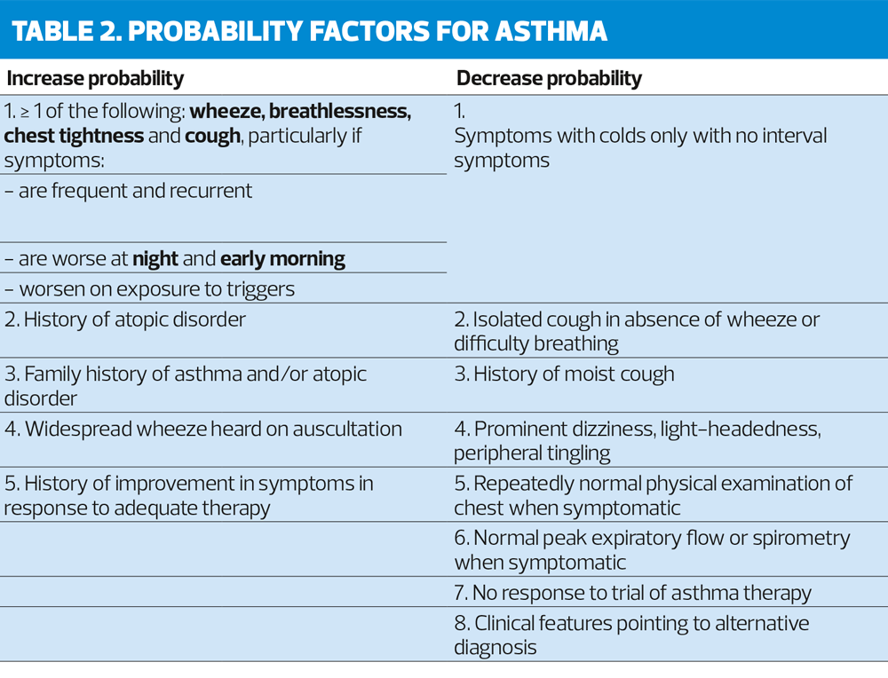 Asthma is currently over-diagnosed, but the trend in diagnosis rates resembles a pendulum, swinging one way and then the other.9 The current British asthma guidelines offer a clear diagnostic pathway utilising the helpful principle of ‘probability’ as the foundation for diagnosis.7 Diagnosing asthma is difficult in all age groups and even more so in young children who are unable to perform diagnostic tests. Children may be unable to clearly describe their symptoms or when they occur, for example a tight chest may be described as a ‘tummy ache’. History taking is fundamental and arguably the most important aspect in the diagnosis of asthma. The history is most likely to be provided by the parent or other carer and its reliability may therefore be affected by parental perceptions and interpretations of their child’s symptoms. Nonetheless, a good history should enable the health professional to determine an index of suspicion, that is the likelihood or probability of asthma (see table 2).