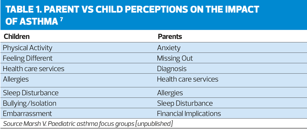 Reduced quality of life in children with asthma and their family is common, with issues such as school absence, parental work absence, sleep deprivation and inability to participate in activities frequently reported.3 One study found that asthma caused activity restriction in 39% of families and caused lifestyle changes in 70%.4 Furthermore, there is a range of evidence confirming that poor asthma control is linked to poor quality of life.5,6 Parental perceptions and perspectives may differ from those of the child with asthma therefore effective management strategies will require health professionals to consider both (see Table 1). Anxiety and depression in children with asthma further impacts upon health related quality of life and is an important consideration because at least 10% of children and young people experience mental health problems and there is significant overlap with those with long-term conditions.8