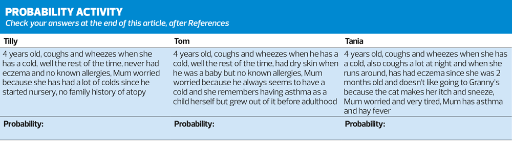 Probability will enable competent asthma trained health professionals to easily identify children in whom asthma is both highly likely (high probability) and highly unlikely (low probability). Often there are features in a child’s history that both increase and decrease the likelihood of asthma (intermediate probability) which parents and health professionals alike may find difficult to understand or interpret. There is no single test that can definitely confirm whether a child has asthma;7 it is only in understanding this that parents and health professionals can work together over a period of time to ensure any diagnosis made is accurate. The implications of an asthma diagnosis on a child and family are significant and there are also financial implications for the NHS, therefore getting the diagnosis right is vital.