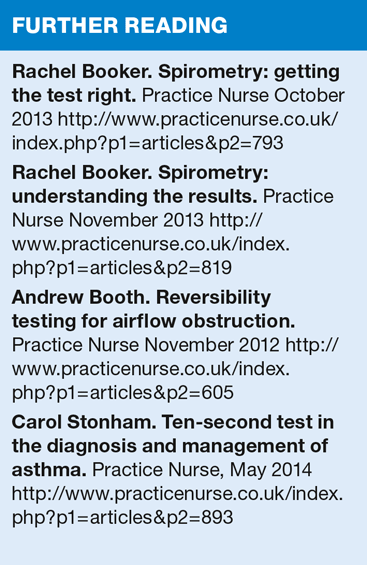 4. Booth A. Reversibility testing for airflow obstruction. Practice Nurse November 2012 http://www.practicenurse.co.uk/index.php?p1=articles&p2=605