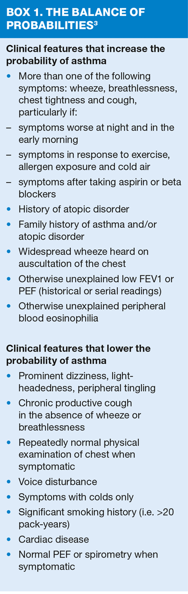 But the BTS/SIGN guideline’s recommendations are that initial diagnosis is made on the balance of probabilities, according to the presenting clinical features. In patients with a high probability of asthma, the first recommendation for both adults and children is to start a trial of treatment, to assess response to treatment and to reserve further testing for those with a poor response.3 (Box 1,2)