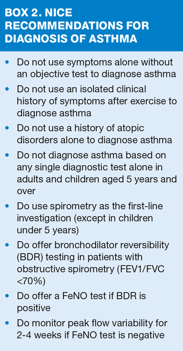 Previously, we would have said that diagnosis should not be made on the basis of lung function alone – symptoms and clinical history must also be taken into account,6 but NICE’s new draft guideline gives far greater weight to objective tests.1 The recommended sequence for testing is: