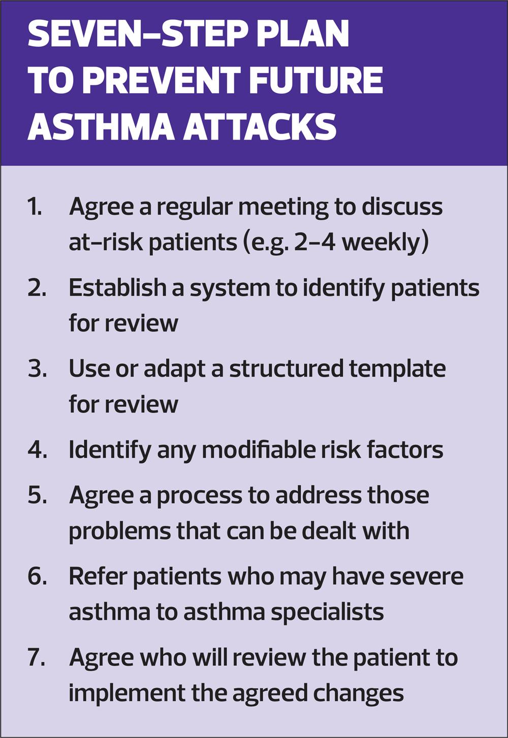 Asthma has not been very high on the UK national agenda for health care and despite poor outcomes,12 being the commonest chronic childhood disease and one of the commonest adult diseases many local providers have not prioritised asthma. Therefore it’s time for primary care practices themselves with the help of a nurse with asthma training to drive this forward. The 7-step plan is quite simple and practical way to address this (Box 1).13