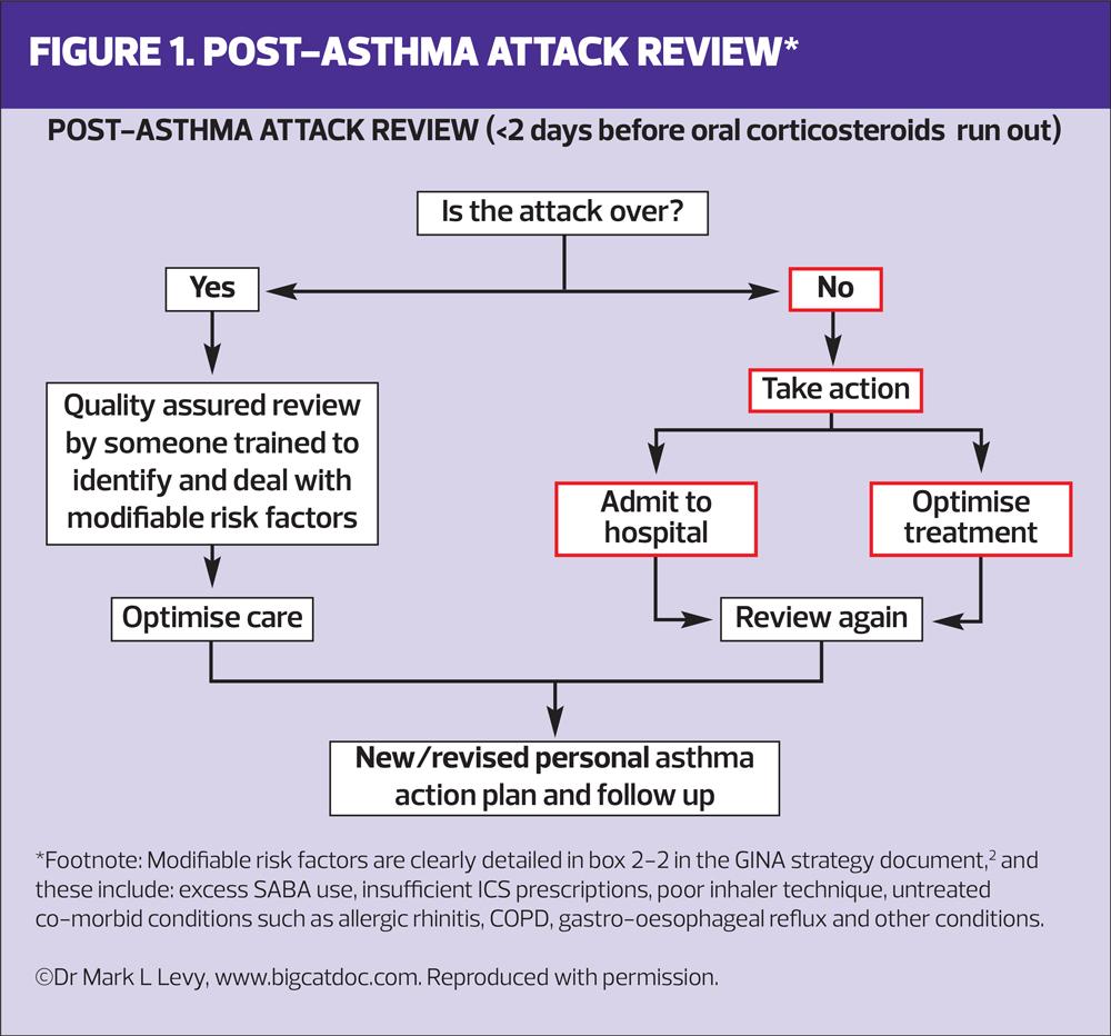 The reason why guidelines recommend a post-attack review is first to establish whether the attack is over or if more treatment or hospital admission is needed; and secondly, so that modifiable risk factors can be identified and dealt with to prevent future attacks (see Figure 1). Ideally the post attack review will be done within a few days of treatment of the attack, and certainly before the OCS runs out. Also, ideally the person should be recording twice daily PEF readings, and some people have their own oximeters and may be recording these values.