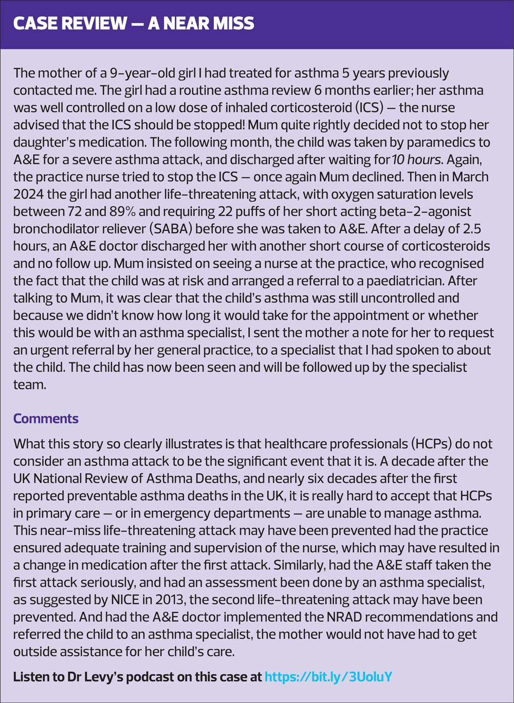 A decade after the UK National Review of Asthma Deaths (NRAD),1 and nearly six decades after the first reported preventable asthma deaths in the UK, it is really hard to believe that HCPs in primary care or in A&E departments continue to manage asthma as an acute disease and not the chronic disease that it is.