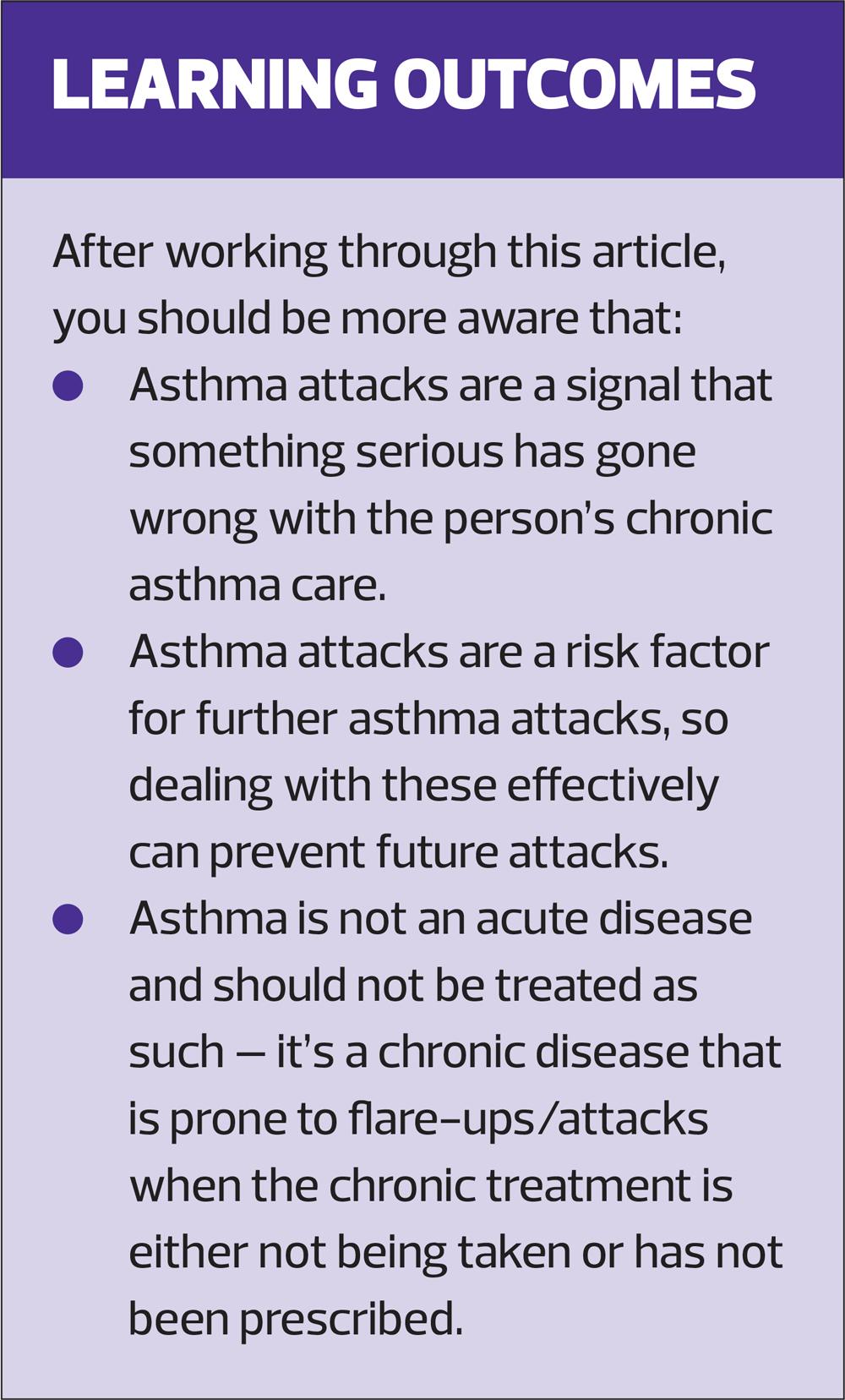 In summary, it is really time for nurses to take a lead in improving asthma care in primary care in the UK. This article has focused on dealing with the major problem to start with – too many people are suffering from poor asthma control and dangerous, distressing attacks. By ensuring attacks are dealt with in accordance with latest guidance to ensure they resolve completely, followed by detailed timely post-attack reviews rather than performing routine annual reviews which may be done on a day when the person’s asthma is well controlled, nurses have an opportunity to end a lot of patient suffering. Then by initiating and implementing a systematic practice approach to deal with all asthma attacks as significant events everyone could benefit – patients as well as practice staff.