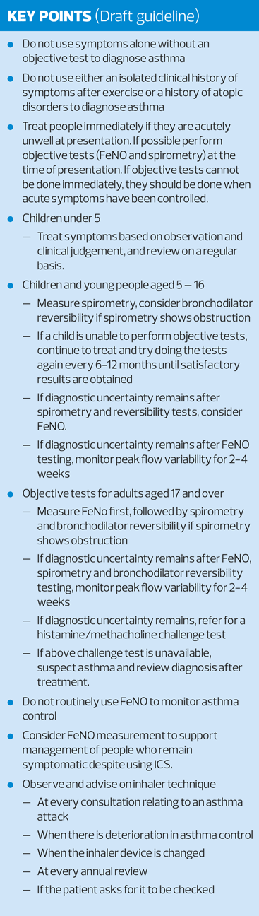 The background to NICE looking for diagnostic improvement is from recent evidence showing that up to a third of patients with an asthma diagnosis now show no active signs or symptoms of the disease so may have been misdiagnosed. NICE is therefore expected to recommend that all patients aged 5 or over should undergo objective testing (including spirometry and FeNO) when they present with symptoms, or once acute symptoms settle. All patients over 5 should undergo spirometry testing, and all those over age 16 FeNO testing. Those aged over 5, if they have normal spirometry, or an obstructive result with negative reversibility should also have their FeNO checked to assist with diagnosis.
