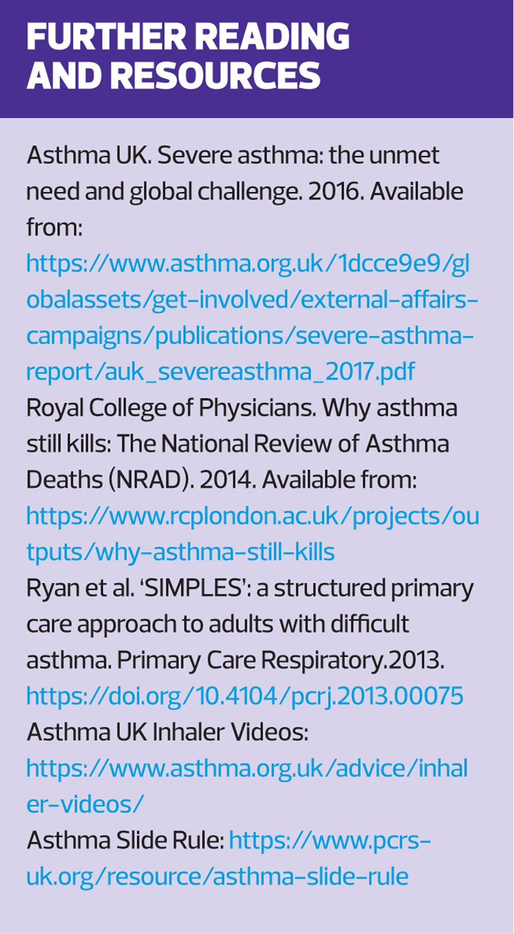 Adherence to treatment and over-use of bronchodilators can be assessed by looking at the patient’s computer record for the number of preventer and reliever inhalers they have been prescribed. Most people with asthma would be expected to use approximately 12 preventer inhalers a year. Although this may, of course, vary depending on the medication, the number of doses in the inhaler and the prescribed dose,7 this simple check can be a useful starting point. And identifying poor adherence is important because the NRAD report found that in 38% of the asthma deaths patients had been prescribed less than four preventers in the previous year and in 80% of the deaths less than the 12 that one would expect if patients were adhering to their prescribed preventer medication.7
