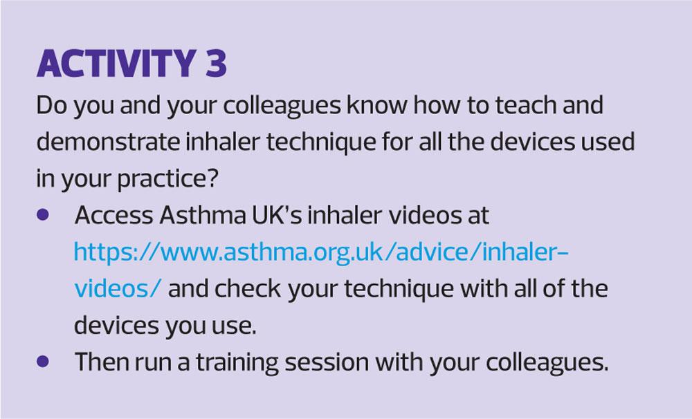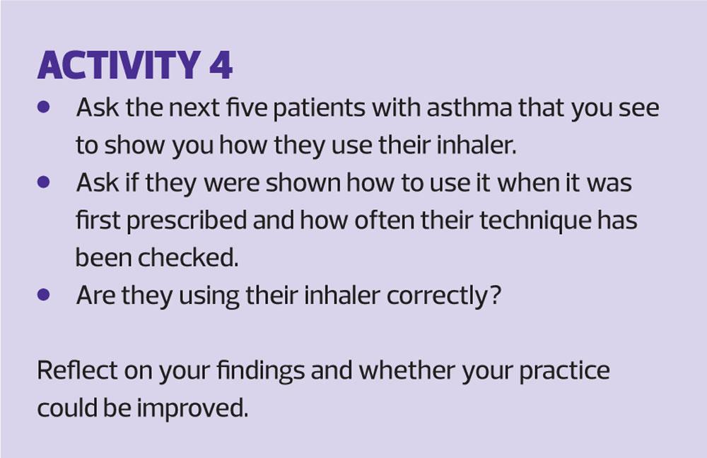 Some patients may over-rely on their reliever inhaler because they are not using their preventer inhaler correctly. It is essential to check that patients are using the correct inhaler technique (see Asthma UK’s inhaler videos for more on inhaler technique, at https://www.asthma.org.uk/advice/inhaler-videos/) and if they are, further investigations into their adherence should be made.