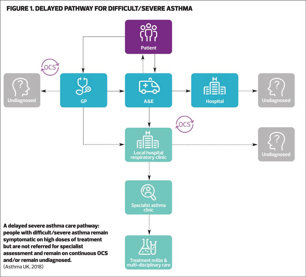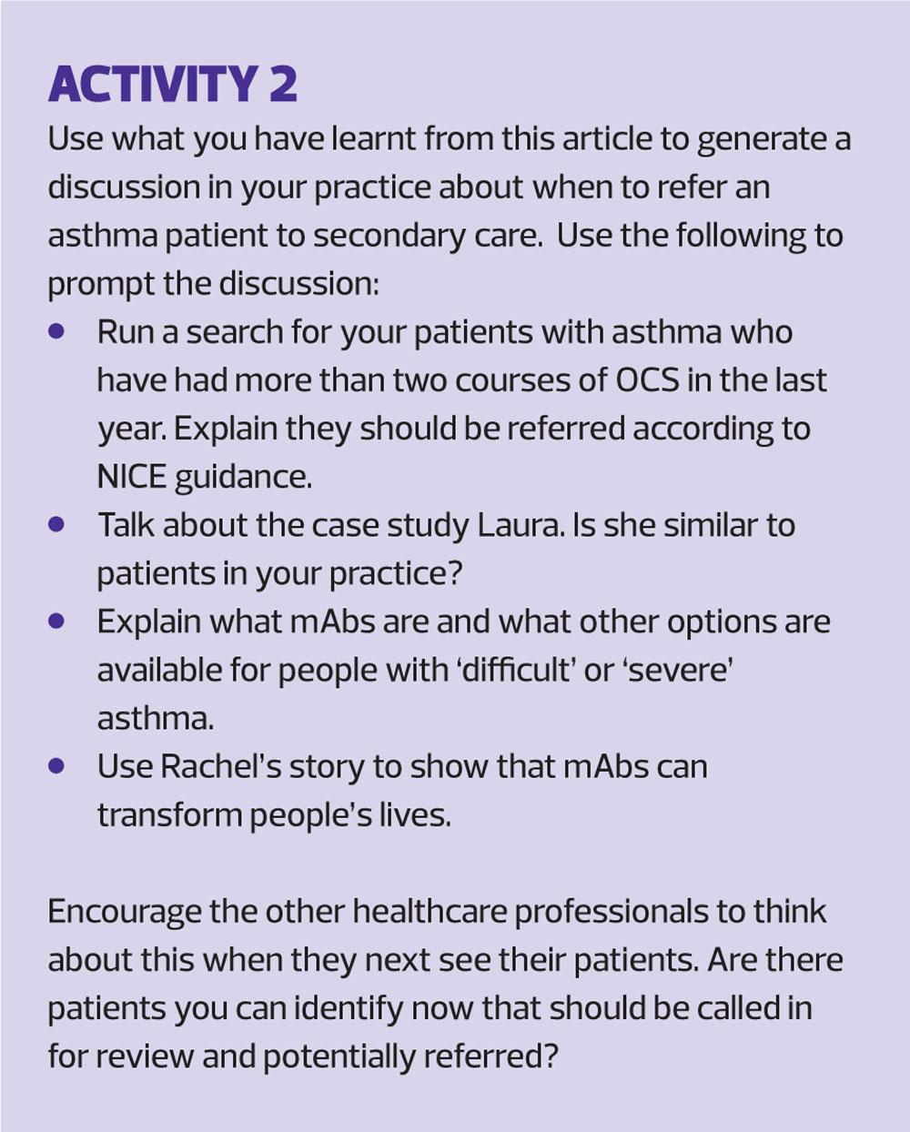 Laura, 29, is on a high dose ICS and is over-reliant on her short acting beta 2 agonist (SABA) reliever inhaler throughout the day. In the last year, she has been prescribed OCS five times and has been hospitalised. She is an ideal candidate for referral to a specialist asthma clinic, but her primary care team (her GP and asthma nurse) has not yet identified her as having difficult/severe asthma.