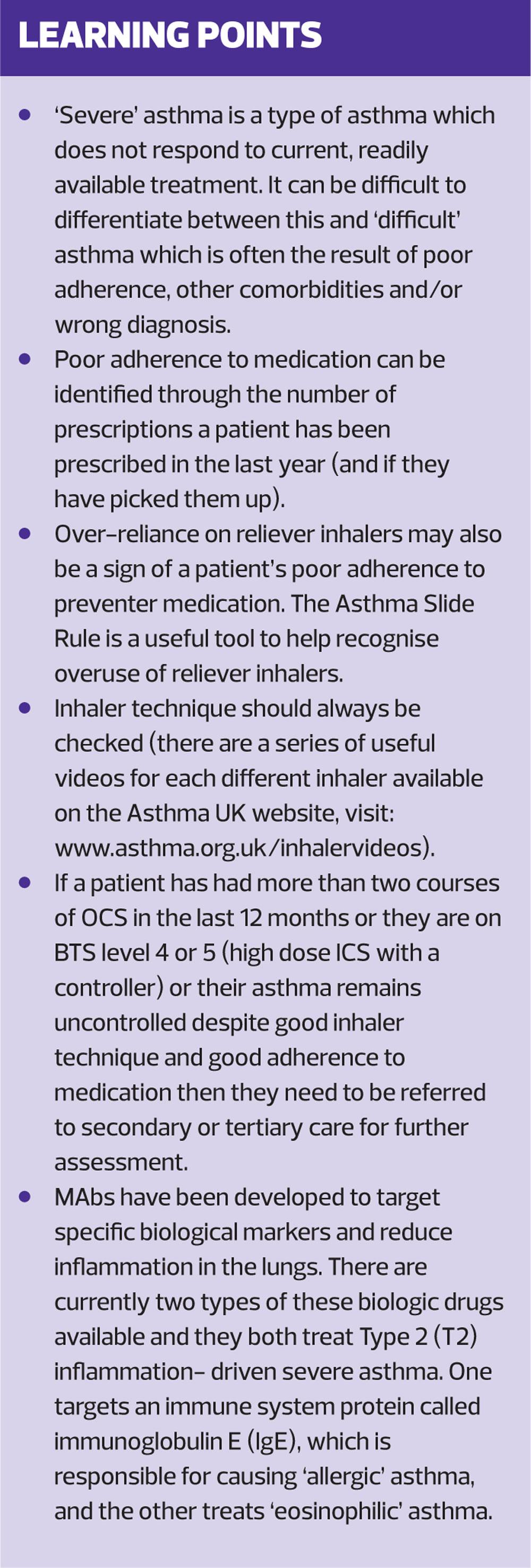 Primary care practitioners can make a real difference to people with difficult or severe asthma by being more aware of those who are suffering uncontrolled symptoms, despite optimal treatment and good adherence, and referring them at the right time.