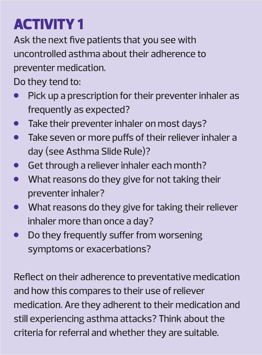 Poor adherence to treatment, either intentional, unintentional, or because of poor inhaler technique, is a common reason for people to have uncontrolled asthma. However, it is important that people who have uncontrolled asthma despite good adherence to their medication and good inhaler technique are referred for a specialist opinion in secondary or tertiary care. This is highlighted by the NICE Quality Standard on asthma, Quality Statement 3: Monitoring asthma control.8 In order to identify these individuals all healthcare professionals who care for people with asthma should routinely check the relevant markers of poorly controlled asthma and make a subsequent referral if necessary.