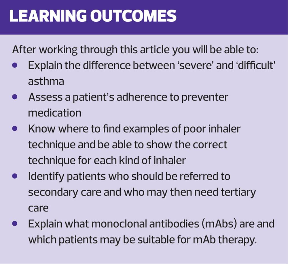 Many patients with ‘difficult’ and ‘severe’ asthma are failing to get the specialist care that could prevent frequent hospital admissions, improve quality of life and result in life-changing treatment. Primary care practitioners can take simple steps to identify and refer those patients most likely to benefit