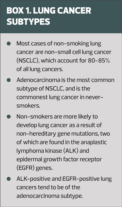 Non-smokers are more likely to have developed lung cancer as a result of a genetic mutation or abnormality. Two genetic mutations that can cause lung cancer are found in the ALK and EGFR genes (see Box 1). In both cases, the mutations are not hereditary but develop later in life.