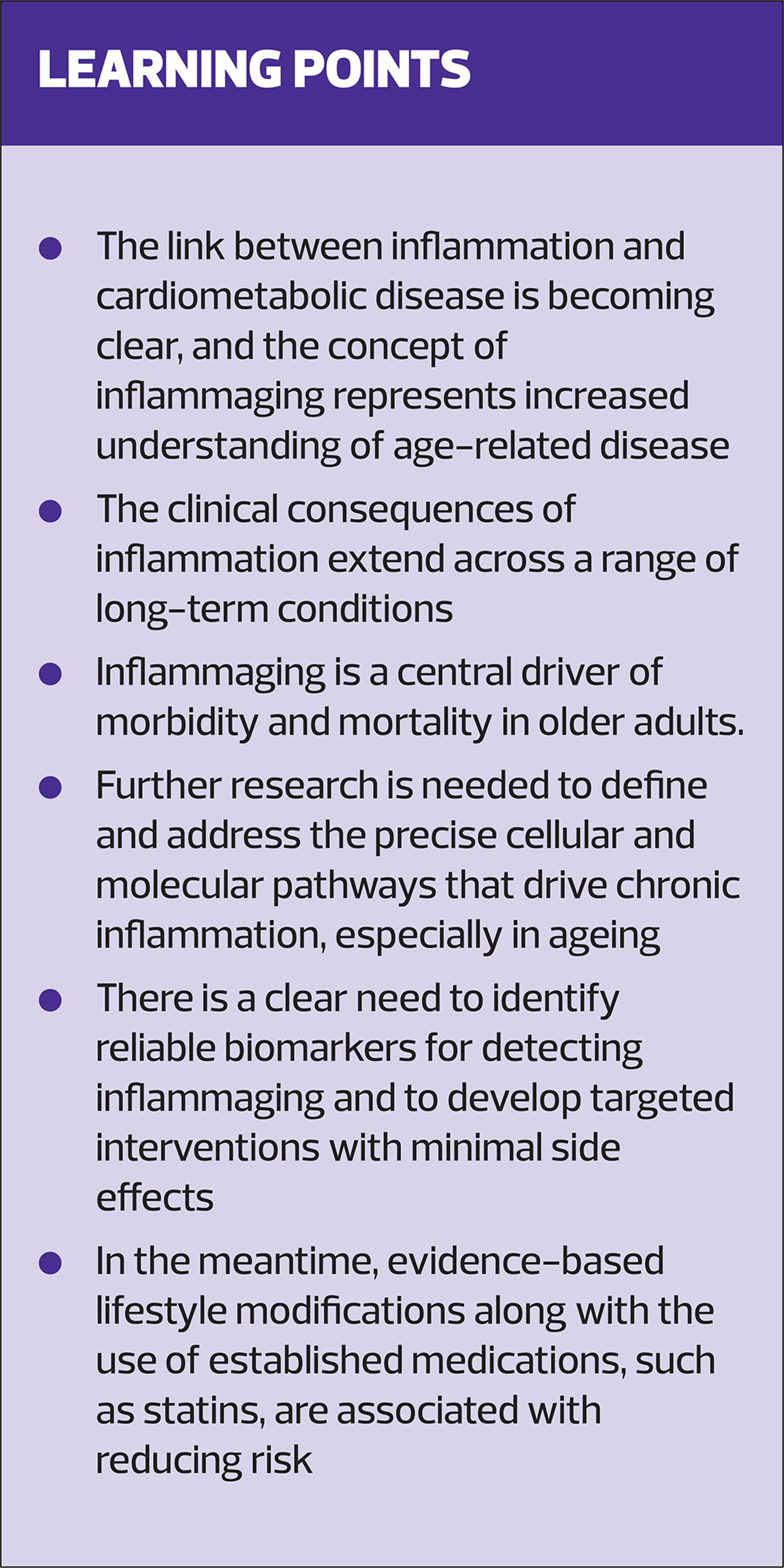 The link between inflammation and cardiometabolic disease is becoming clear, while the concept of inflammaging represents a paradigm shift in our understanding of age-related disease. The clinical consequences of inflammation extend across a range of long-term conditions, underscoring the importance of recognising this link and intervening early with lifestyle changes and medication.Inflammaging is a central driver of morbidity and mortality in older adults.However, despite significant progress, numerous questions remain regarding the mechanisms and management of inflammation and inflammaging. Further research is needed to define and address the precise cellular and molecular pathways that drive chronic inflammation, especially in ageing, and the importance of identifying reliable biomarkers for detecting this and developing targeted interventions with minimal side effects is clear. Nonetheless, ageing is shaped by genetic, environmental, and lifestyle factors, not simply biological change, and this will necessitate a personalised approach to prevention and treatment.In the future, it may be considered standard practice to integrate an assessment of inflammatory status into routine clinical practice, allowing us to implement novel pharmacological interventions as evidence emerges.For now, the key is to promote evidence-based lifestyle modifications along with established medications, such as statins, which are associated with reducing risk.Multidisciplinary collaboration between primary and secondary care, involving GPs, nurses, pharmacists, cardiologists, diabetologists, nephrologists, geriatricians and immunologists will enhance the development and implementation of effective strategies to combat the burden of inflammatory changes and inflammaging.