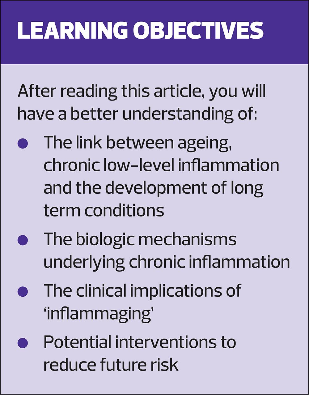 In recent years there has been an increasing level of interest in the impact of inflammation on the pathophysiology of cardiorenal metabolic conditions such as diabetes, chronic kidney disease and heart disease, neurodegenerative diseases such as dementia and Parkinson’s disease, and other long-term conditions such as chronic obstructive pulmonary disease.People living with these conditions often have increased inflammatory markers including raised levels of ferritin, C-reactive protein and serum uric acid.Ageing is also associated with chronic low-level inflammation, which, coupled with a reduced capacity for tissue repair, increases vulnerability to disease. The term for this relationship between ageing and inflammation, is 'inflammaging'. Healthcare professionals need to be aware of the link between inflammation, long-term conditions and ageing in order to make appropriate recommendations to reduce the effect on the onset and progression of chronic and age-related diseases. This article explores the biological mechanisms underpinning chronic inflammation, examines its clinical consequences, particularly on older people, and explores the potential interventions which could implemented to reduce future risk.