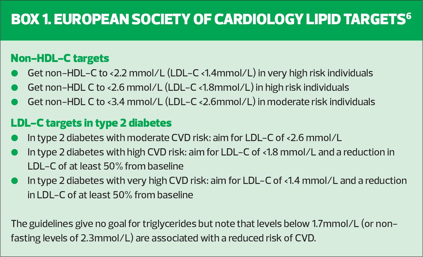 In the UK, non-HDL-C levels are often used to determine whether lipid lowering targets have been reached; internationally, both non-HDL-C and LDL-C are used as target values. The current Accelerated Access Collaborative (AAC) guidance and NICE both recommend using non-HDL cholesterol as the target value when treating lipids.2,5 According to the AAC recommendations, once the decision has been made to start lipid lowering medication, a full non-fasting lipid profile should be measured after three months with the aim of reducing non-HDL-C by 40%. However, this target has many critics, who point out that in people with a high starting point, a 40% reduction may still not be enough. The Primary Care Cardiovascular Society takes the view that an absolute non-HDL-C value of 2.5mmol/L or lower is preferable. A non-HDL-C of 2.5mmol/L is equivalent to an LDL-C of 1.8mmol/L. The non-HDL-C value is the key target for secondary prevention in the Quality Outcomes Framework, again with a recommendation to aim for a value of 2.5mmol/L or lower.