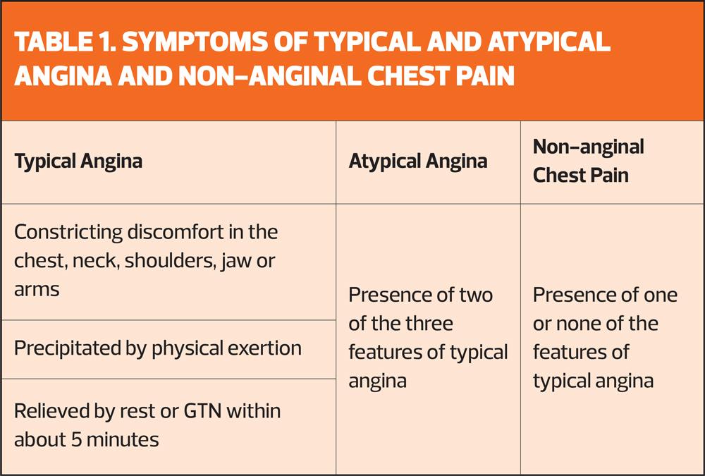 A diagnosis of stable angina will usually be made following a comprehensive clinical assessment including an evaluation of the symptoms (Table 1), cardiovascular risk factors and investigations including blood tests and a 12-lead ECG. This may be followed by further diagnostic testing including CT coronary angiography or an exercise ECG, and additional non-invasive functional testing or coronary angiography where indicated.3