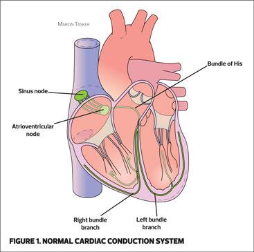 The normal heart rhythm starts in the sino-atrial (SA) node, located in the wall of the right atrium and controlled by the autonomic nervous system. The SA node is the heart’s natural pacemaker and will usually generate electrical impulses at a rate of 60-100 times per minute. These impulses spread across the atria to the atrioventricular (AV) node. The AV node is the gatekeeper that allows impulses to pass through to the ventricles via the Bundle of His, the right and left bundle branches and the Purkinje fibres.6 (Figure 1)