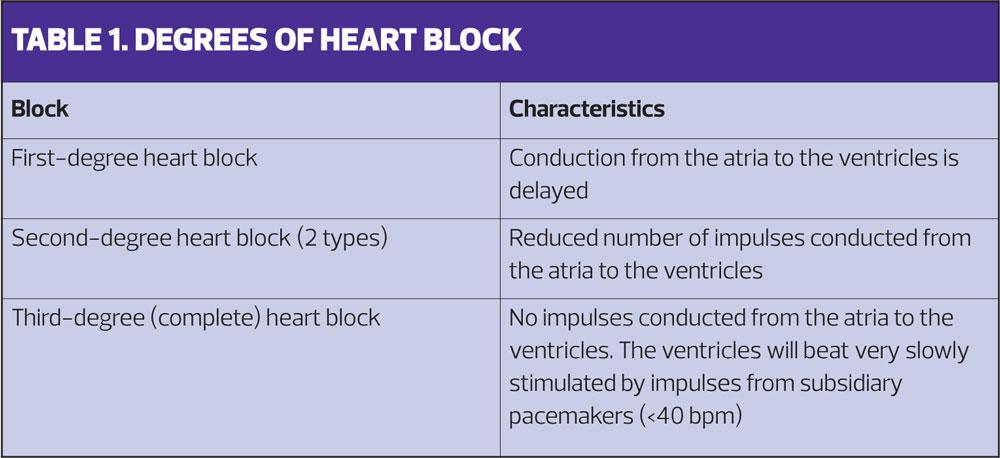 Forms of heart block are expressed as degrees of block and the symptoms and consequences, along with the need and urgency for treatment, usually increase with the severity of the block (Table 1). Symptoms may range from none at all with a first degree block, to sudden loss of consciousness requiring emergency intervention in third degree, or complete, heart block. Patients with second degree or complete heart block will usually require a pacemaker.7