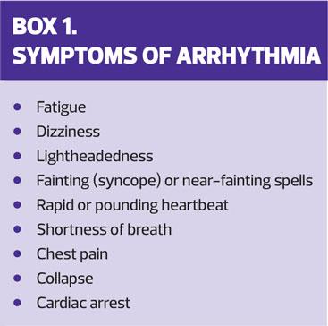 The impact of arrhythmia on the patient will vary according to a variety of factors, particularly the severity of the condition and the associated symptoms. Patients may experience their heart beating too quickly, too slowly or in an irregular manner. Symptoms may include palpitations, breathlessness, dizziness and fatigue; and in the most severe cases arrhythmia can lead to loss of consciousness or, ultimately, sudden cardiac death.4 (Box 1) The symptoms can be extremely frightening for patients and their families and the fear of sudden cardiac death can result in severe anxiety and a restricted lifestyle, which can in itself be detrimental to overall cardiovascular risk.5