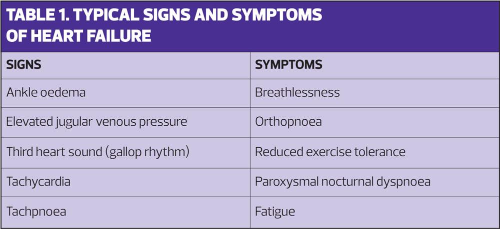 In terms of diagnosis, practice nursing teams are ideally placed to detect early signs and symptoms of heart failure (Table 1), given that they are largely responsible for the routine monitoring of patients with coronary heart disease and hypertension, the underlying causes in the majority of cases. Nurses may be responsible for the initiation and titration of medicines, or work in partnership with GP’s and specialist nurses to ensure patients are on the optimal therapy and have access to appropriate information to help them manage their condition. Routine monitoring and support are essential components of heart failure care throughout the trajectory of the disease and given that heart failure remains a life-limiting condition, the palliative care needs of the patient and their family should be considered by all involved in their care.6