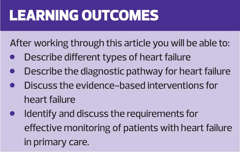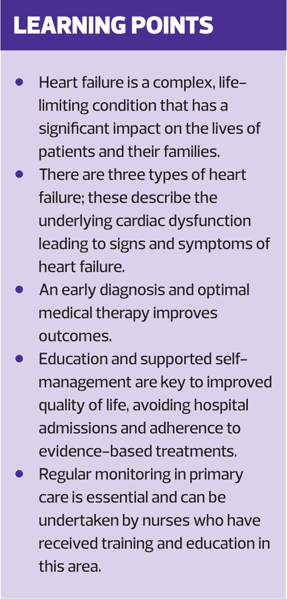 Heart failure presents a significant burden to patients, their families and the wider health and care systems. Optimised treatments, supported self-management and regular review can both extend and improve quality of life; and primary care nursing teams can add tremendous value throughout the patient pathway