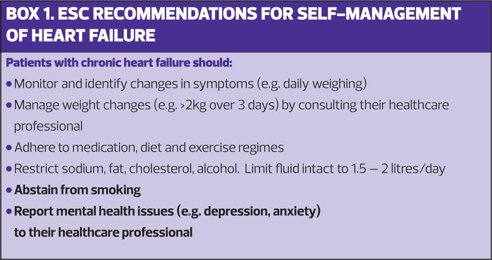 Self-management in heart failure should be underpinned by education and support to help the patient undertake daily activities to monitor and maintain their condition. Good self-management is linked to reduced mortality and morbidity, including fewer hospital admissions.12 The ESC recommends a number of steps for self-management of heart failure. (Box 1)