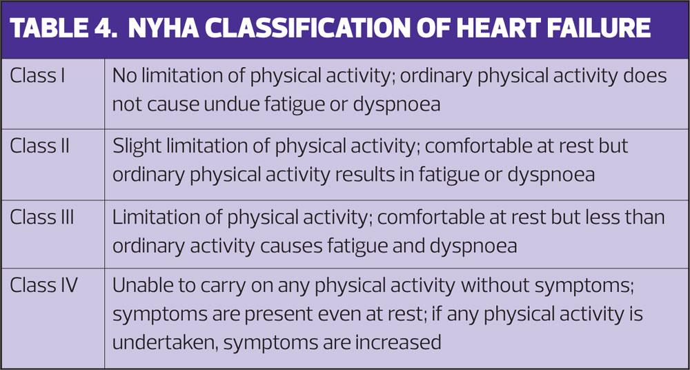 Patients with heart failure need to be regularly monitored and NICE recommends a minimum review period of six months when stable.6 In addition to routine observations, blood tests and review of medications there also needs to be a review of functional capacity. The NYHA Functional Classification,13 is the most commonly used tool and can be added to your clinical template for ease of use and to enable coding to the patient record. (Table 4) Regular use of the NYHA classification will not only help patients describe how their symptoms are affecting their lives but also enable comparison of functional capacity over time, help monitor the effects of treatments and detect deterioration.