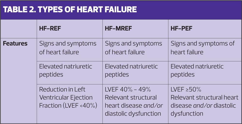 Heart failure is largely described as two-types, heart failure with reduced ejection fraction (HF-REF) and heart failure with preserved ejection fraction (HF-PEF). In recent years a third descriptor-type of heart failure with moderately reduced ejection fraction (HF-MREF) has been added. (Table 2) Signs and symptoms may be similar for all types so the diagnostic category is determined by imaging of the heart, usually echocardiography. The treatments for each type differ so it is really important that a correct diagnosis is made.6