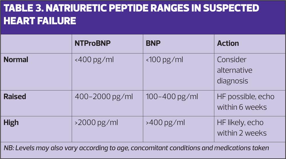 The NICE diagnostic pathway recommends that, following detailed history taking and a clinical examination, patients who have previously had an MI are referred directly for echocardiography.6 In patients without previous MI a blood test should be performed to measure natriuretic peptides. In most cases this will be a NTproBNP test (N-terminal pro b-type natriuretic peptide) that will, if raised, support the diagnosis of heart failure and if normal, make the diagnosis of heart failure unlikely.6 As can be seen in Table 3 the reference ranges vary according to the type of test used so it is important to be aware of which is in use in your local area.
