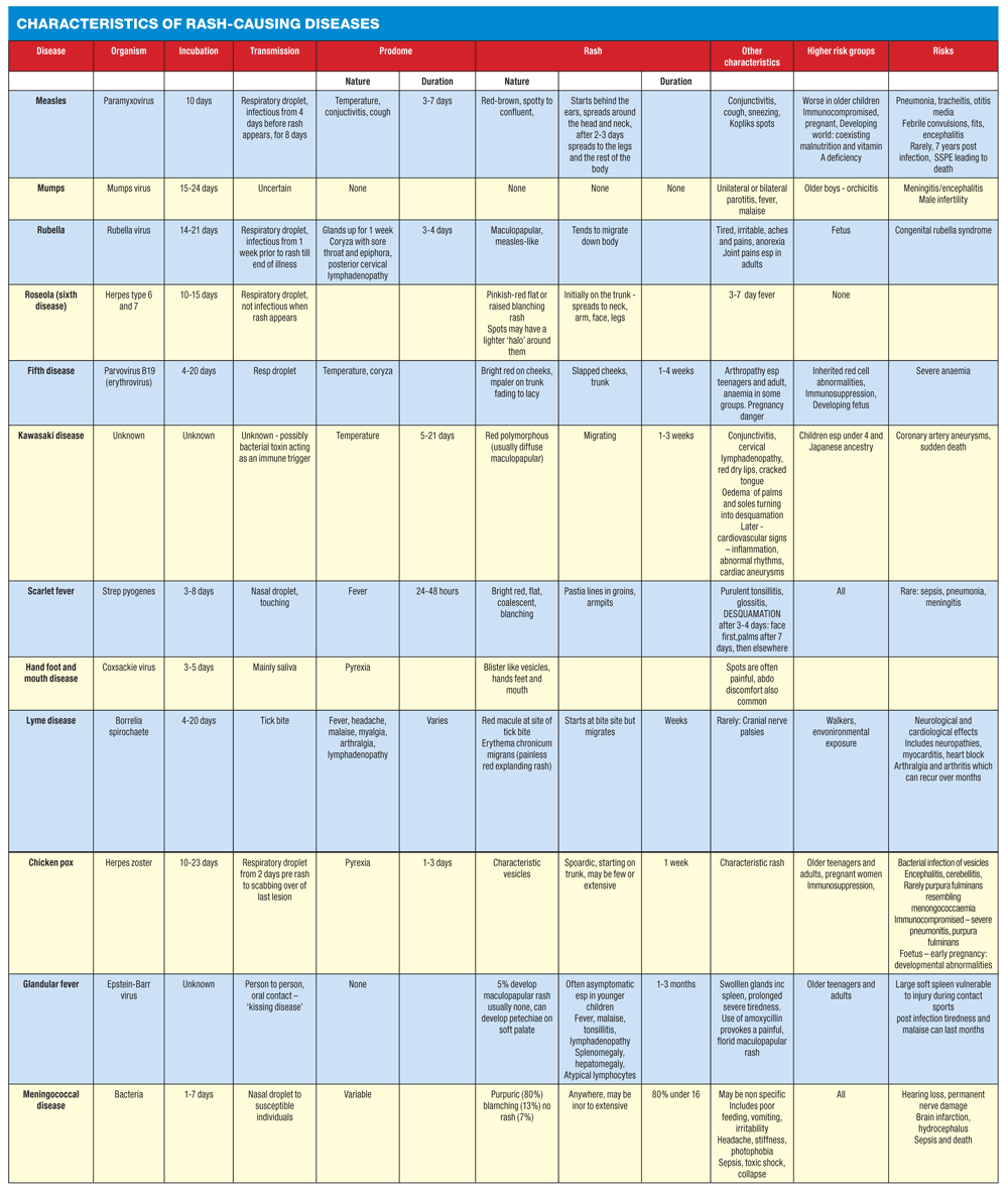 In Fifth disease the period of contagiousness ends with the appearance of the rash. Table 1 provides a reminder of some of the features of the common red rashes of childhood.