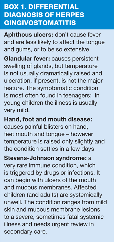 Herpes simplex mouth infection is very unpleasant for the child, whose entire mouth is extremely painful. They often have a temperature and lymphadenopathy, and they are systemically unwell, so the differential diagnoses are important to consider (see Box 1). They are typically drooling as even dealing with saliva is painful – and breath often smells bad.