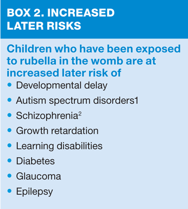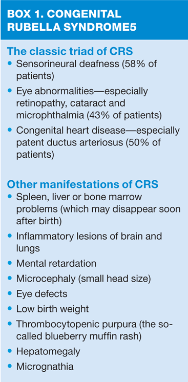 The rubella virus is teratogenic. It crosses the placenta even before the rash appears, and prevents fetal cells from dividing, leading to congenital rubella syndrome (CRS). CRS was first described in 1941 after an epidemic in Australia. The syndrome consists of a number of serious developmental problems which are listed in Box 1. Affected babies also secrete active rubella virus and are infectious for some months after birth.