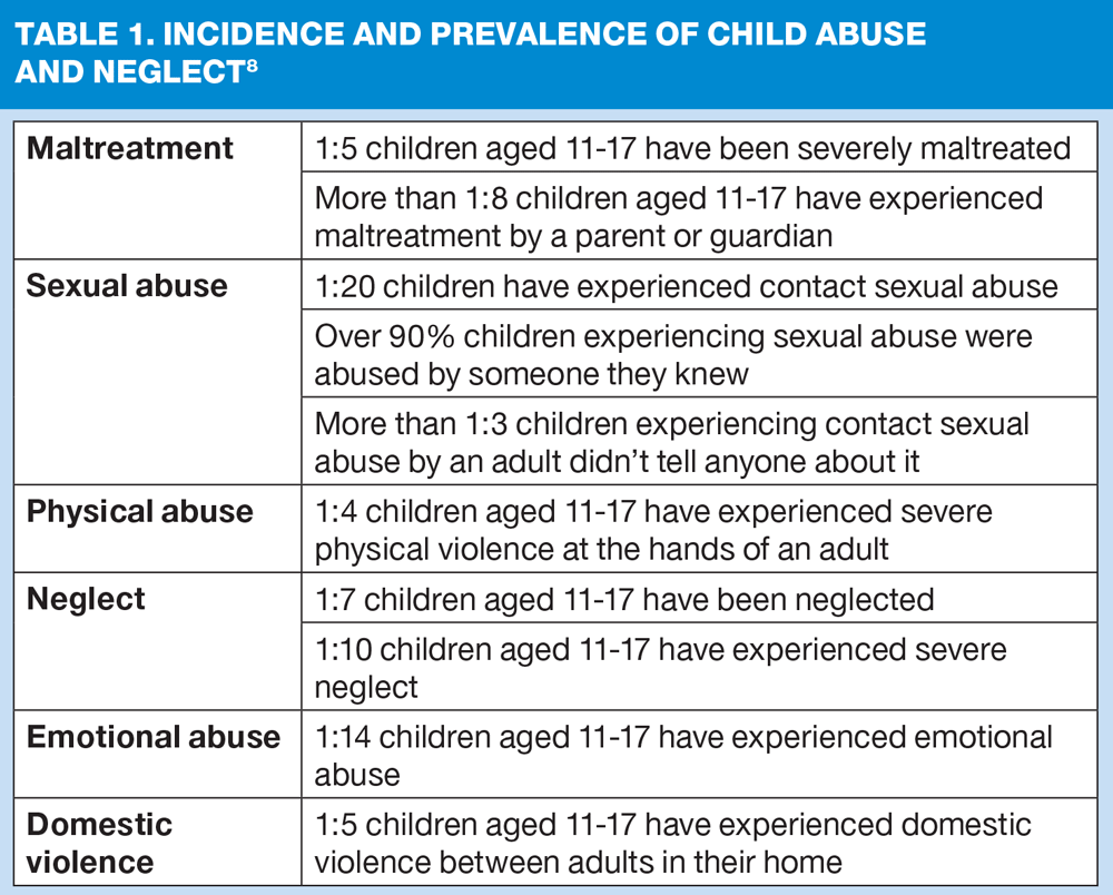 Distressingly, there have been many high profile cases of severe and horrific abuse of children in recent years. Recommendations from the serious case reviews (SCRs) of Baby Peter, Hamzah Khan and Daniel Pelka highlight the need for greater awareness of the risks of neglect and maltreatment together with improvements in inter-agency communication and training of professionals to protect children.4-6 The NSPCC’s 2014 report ‘How safe are our children?’ states that ‘one child dies at the hands of another person every week’ with 69 child homicides recorded across the UK during 2012-13.7 The most recent NSPCC figures suggest that approximately 50,500 children are at risk of abuse and reveal the prevalence of maltreatment and neglect across the UK. The figures use the findings from studies of 11-17 year-olds to indicate the extent of child abuse today (Table 1).8