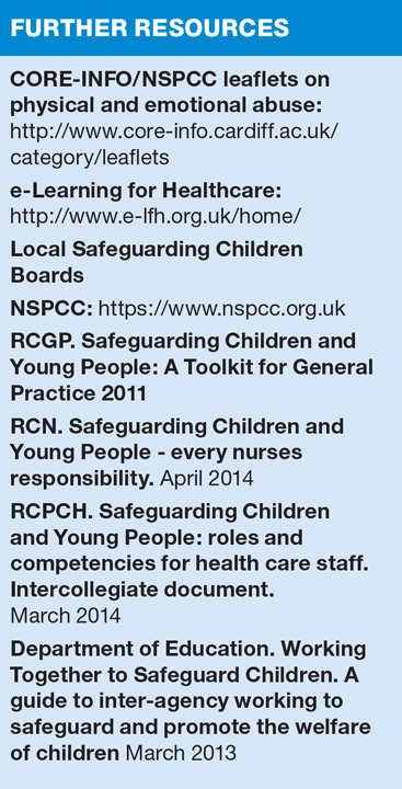 The 2014 intercollegiate document ‘Safeguarding children and young people: roles and competencies for healthcare staff’ sets out a framework of competencies for all staff working in the healthcare setting in their safeguarding role. It also gives guidance for the appropriate levels of training required for health professionals depending on their role and amount of contact with children.16 Online training modules, such as from the e-Learning for Healthcare website, are available for practice nurses. Local policy may also incorporate team-based learning for level 3 competencies through the local Safeguarding Children’s Board and CCG.