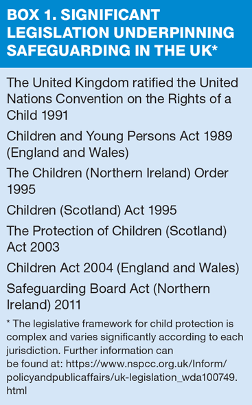 Each country within the UK has specific guidance for safeguarding and the duty to protect the rights of all children, underpinned by its own legislation. The National Society for the Prevention of Cruelty to Children (NSPCC) provides a useful fact sheet into the complex laws for each of England, Northern Ireland, Scotland and Wales in relation to safeguarding3. (Box 1)