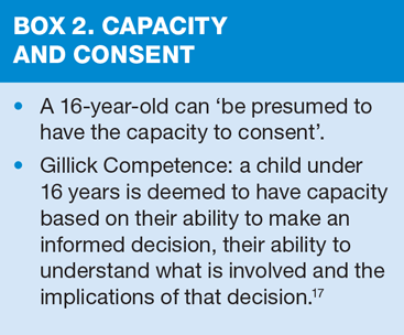Consent should be sought prior to sharing information about an at-risk child. If the child has capacity they can provide the consent themselves, following an open and honest discussion (Box 2). An adult, or an adult with parental responsibility, should be asked for consent if the child does not have capacity. Disclosure of information can still be made without consent if the child is deemed to be at risk of maltreatment or neglect or, if by seeking consent, it puts a child further at risk of harm.