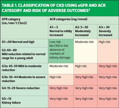 Table 1, adapted from the Kidney Disease Improving Global Outcomes (KDIGO) diagram, explains how combining the eGFR and the ACR will give a more holistic overview of the prognosis of CKD (and, incidentally, CVD) for each individual.