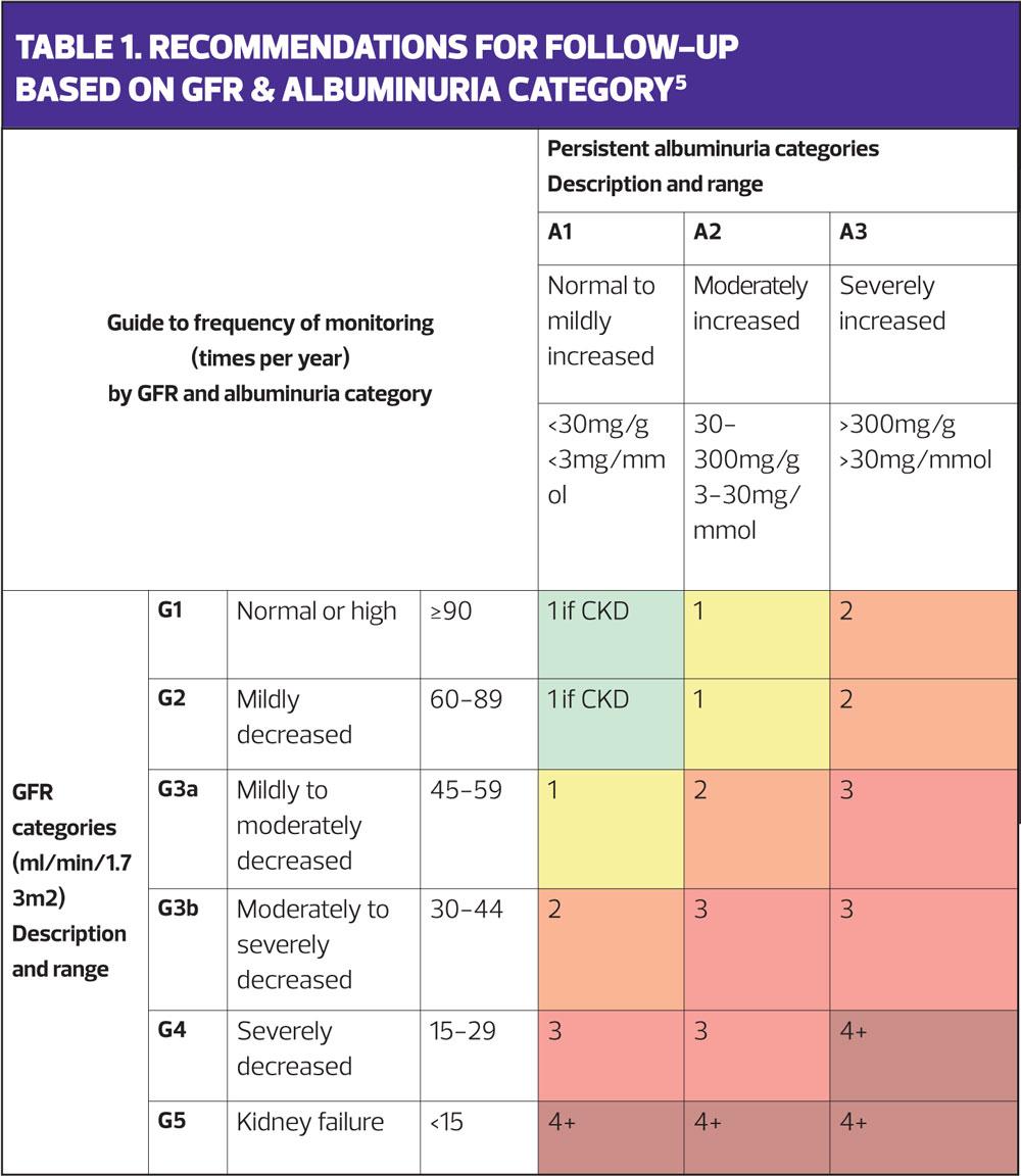Table 1, from the NICE guideline,5 indicates the number of times per year that people with CKD should be monitored, although this can be tailored to meet the needs of each individual. Each review should prompt the clinician to consider the patient’s current medication and if, or how it might need to be adjusted if the renal function has altered. Reviews should also include lifestyle advice such as smoking cessation, weight management and encouragement to follow a healthy eating and activity programme which will improve holistic well-being as well as kidney health.5 As people with CKD are at high risk of cardiovascular disease, both lifestyle and pharmacological interventions should be discussed with a view to reducing these risk factors.5