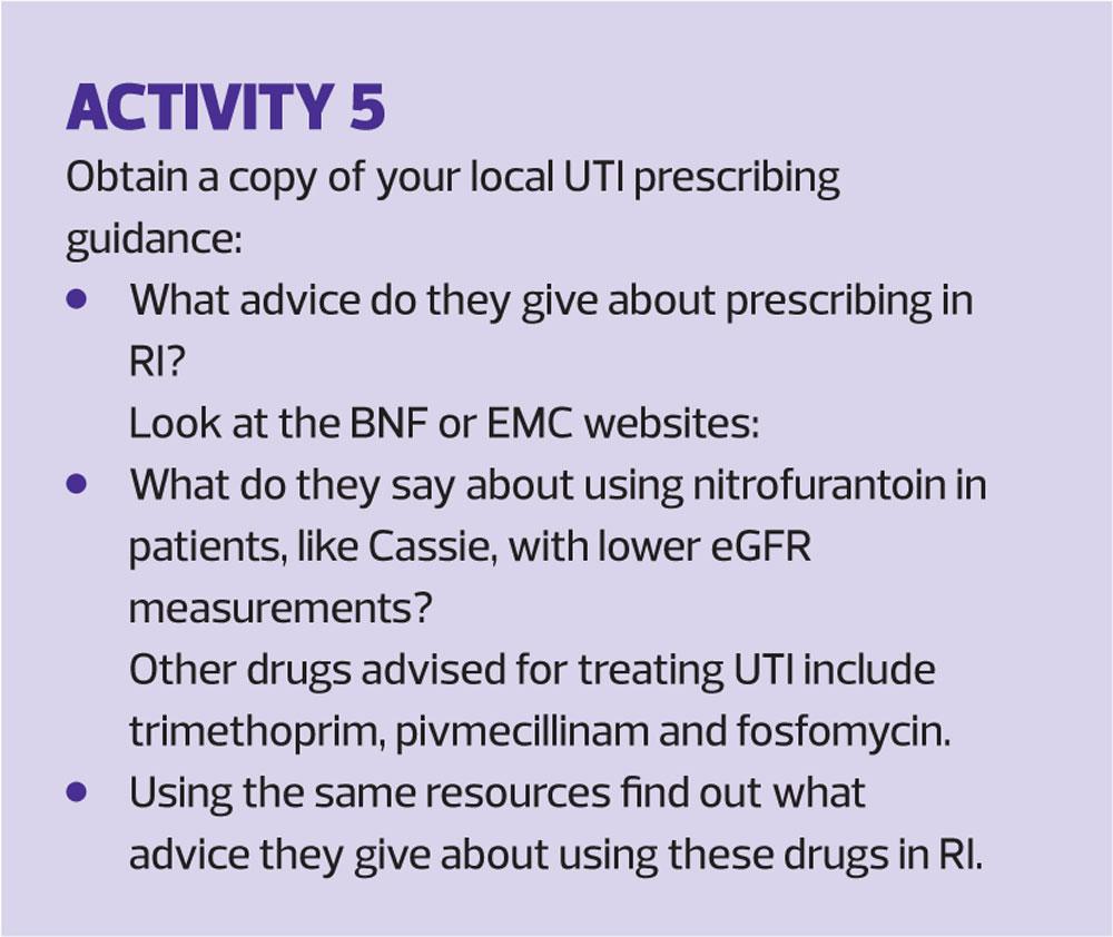 For advice on treating UTIs, including in adults, children, pregnant women and people with RI, the recently published NICE guidance on recurrent UTI is worth reading.15 These guidelines recommend using nitrofurantoin 100mg MR bd for 3 days as a first line option if the eGFR is 45ml/min or more. This is not the case for Cassie as her eGFR is only 27ml/min. Of note, the NICE guidelines recommend that this drug and dose may still be used with caution if the eGFR is between 30-44ml/ minute to treat uncomplicated lower UTI if the potential benefit is deemed to outweigh the risk.