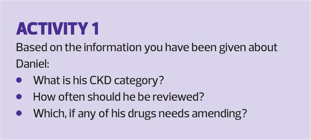 According to the NICE chart, (Table 1) Daniel is CKD category G3a A1 and he needs reviewing annually.
