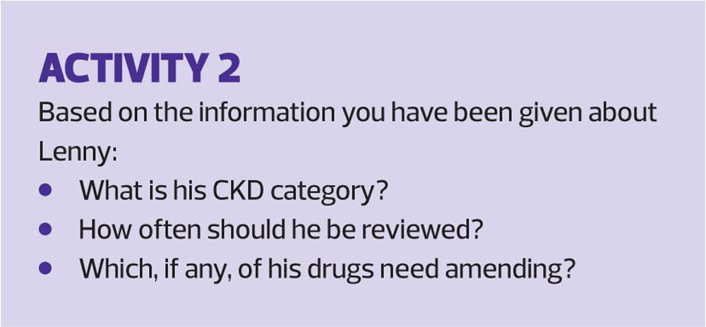 Lenny’s CKD category is G3b A1 and he needs to be reviewed twice a year. Regarding his drugs, the EMC advises the following:
