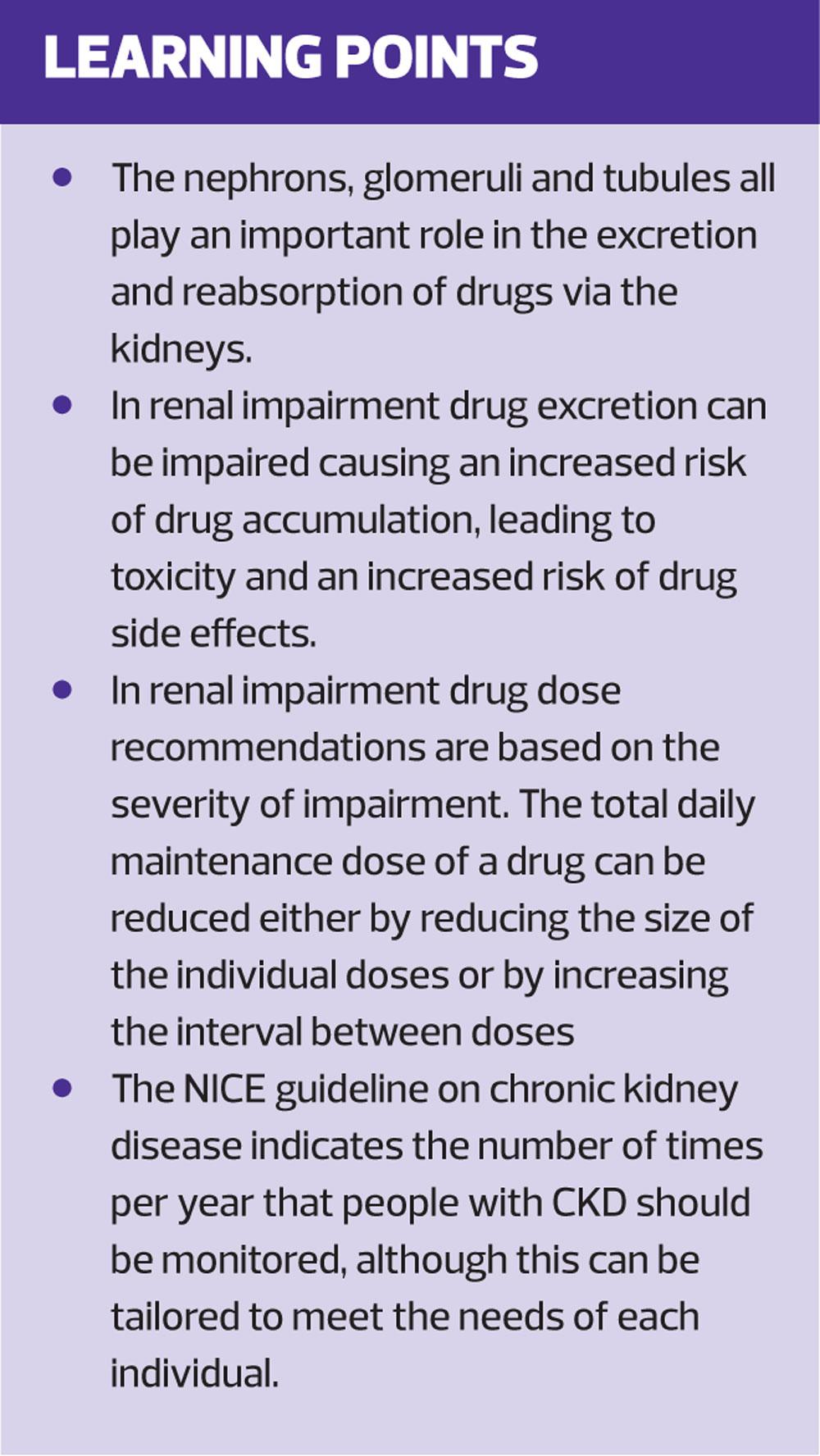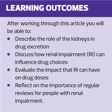 The kidneys are the key organ for drug excretion and renal impairment can have a significant effect on drug levels, efficacy and toxicity. Drug choices and doses will be affected by the presence and severity of RI and people on medication should be assessed regularly to determine whether they are renally impaired and if so, how their medication should be amended as a result. All nurses should be aware of these issues and should be able to act within their code of conduct to individualise care, practise effectively and preserve patient safety.