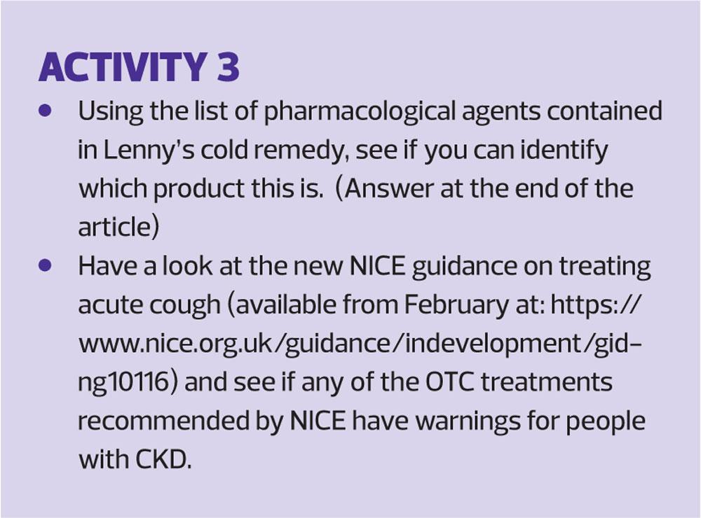 - Cold remedy: further investigation reveals that Lenny’s cold remedy, which is commonly bought OTC, contains paracetamol, pholcodine, promethazine hydrochloride, dextromethorphan hydrobromide and pseudoephedrine hydrochloride. The summary of product characteristics on the EMC website advises that any level of RI should elicit caution for use for this product and that it is contraindicated in severe RI.